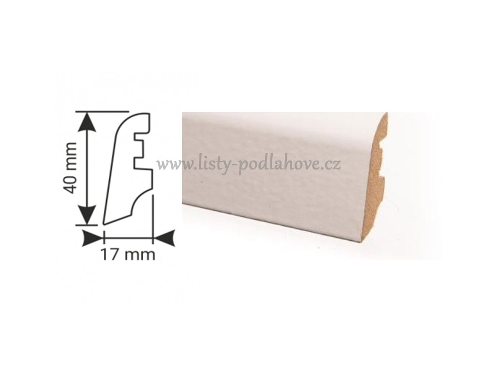 Soklové lišty KP40 s jádrem MDF (polotvrdá dřevovláknitá deska (anglicky medium-density fibreboard, MDF) je multifunkční alternativou masivního dřeva. Lišta je potažena dekorativní fólií.