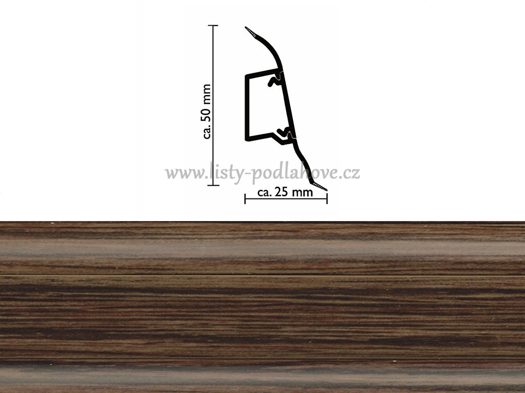 Lišta SLK 50 je vyrobena z materiálu na bázi PVC a je opatřena měkkými manžetami u podlahy i stěny. Samozřejmostí je vhodné příslušenství (rohy, kouty, spojky a koncovky), které barevně přesně odpovídá dekoru lišty.